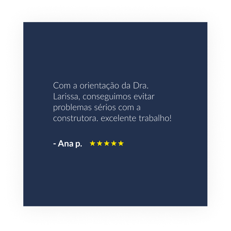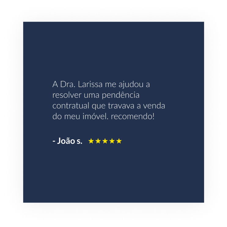 Com especialização em Direito Imobiliário, Larissa Souza atua tanto na esfera extrajudicial quanto na judicial. Sua missão é proporcionar segurança jurídica de forma personalizada e individualizada, construindo relações de confiança e transparência com seus clientes.