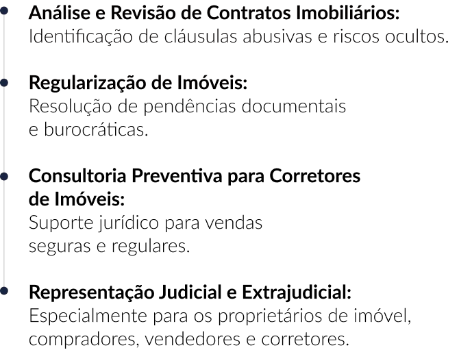Desde questões contratuais até litígios judiciais, oferecemos suporte jurídico completo para proprietários, compradores, vendedores, corretores e ações imobiliárias judiciais.