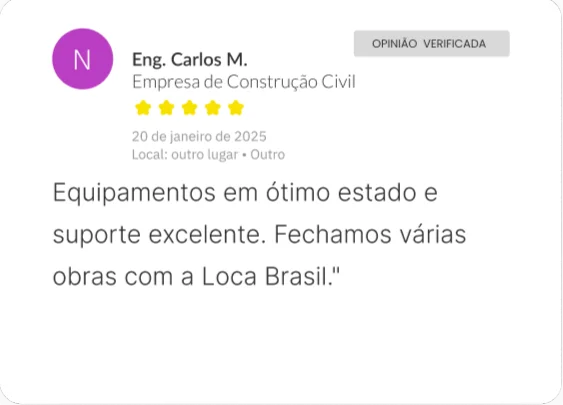 A Loca Brasil nasceu com o propósito de ser referência em soluções operacionais para grandes obras e projetos de infraestrutura. Nosso diferencial é a seriedade com que tratamos cada contrato: operamos com lucidez, transparência e alto padrão técnico. Aqui, não oferecemos apenas máquinas entregamos confiança.