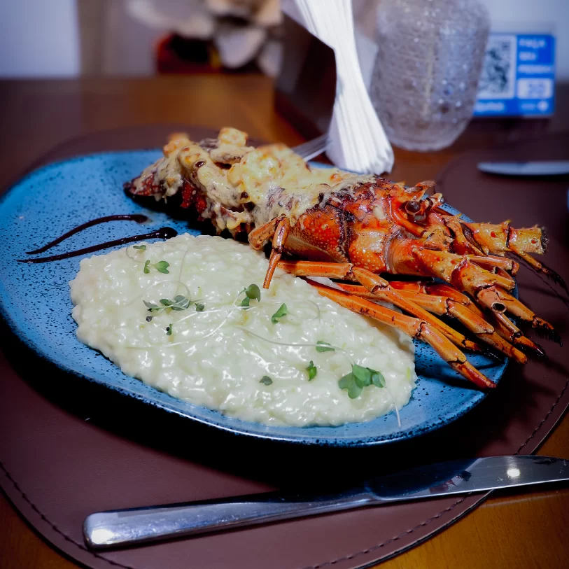 O restaurante também oferece opções de pratos mediterrâneos, peixes, frutos do mar, carnes e saladas.